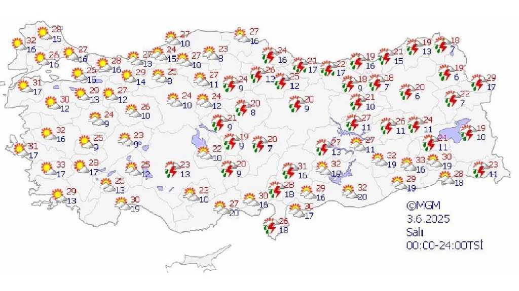 3 Haziran Salı günü İstanbul 27, Ankara 24, İzmir 31, Antalya 30, Diyarbakır 32, Trabzon 19, Erzurum 20 derece.