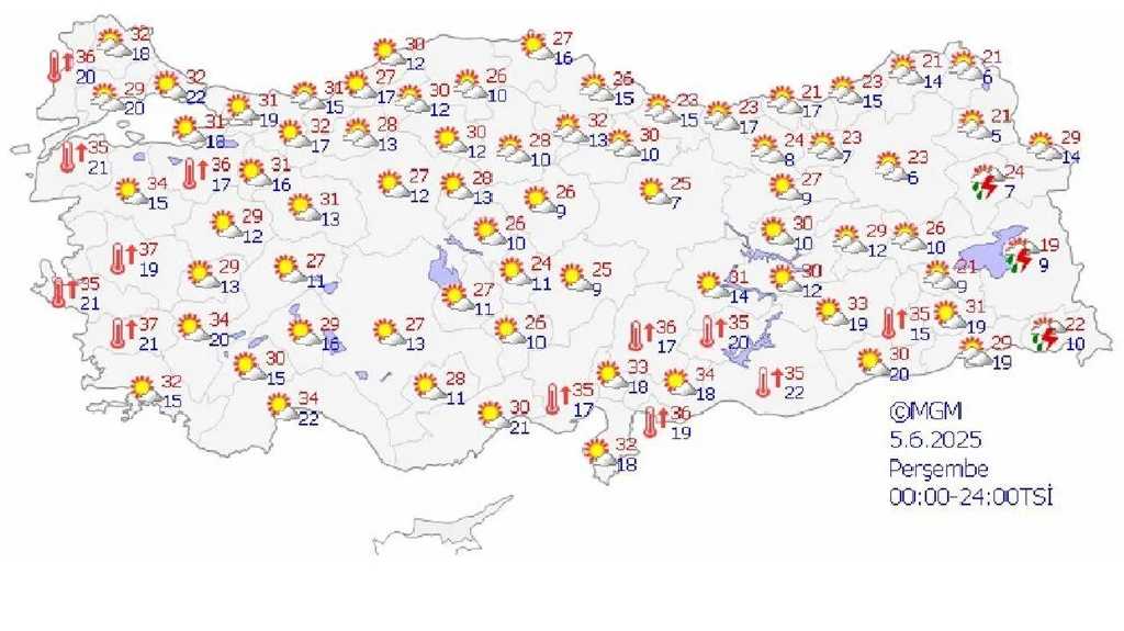 Arefe günü 5 Haziran Perşembe İstanbul 32, Ankara 27, İzmir 35, Antalya 34, Diyarbakır 33, Trabzon 21, Erzurum 23 derece.