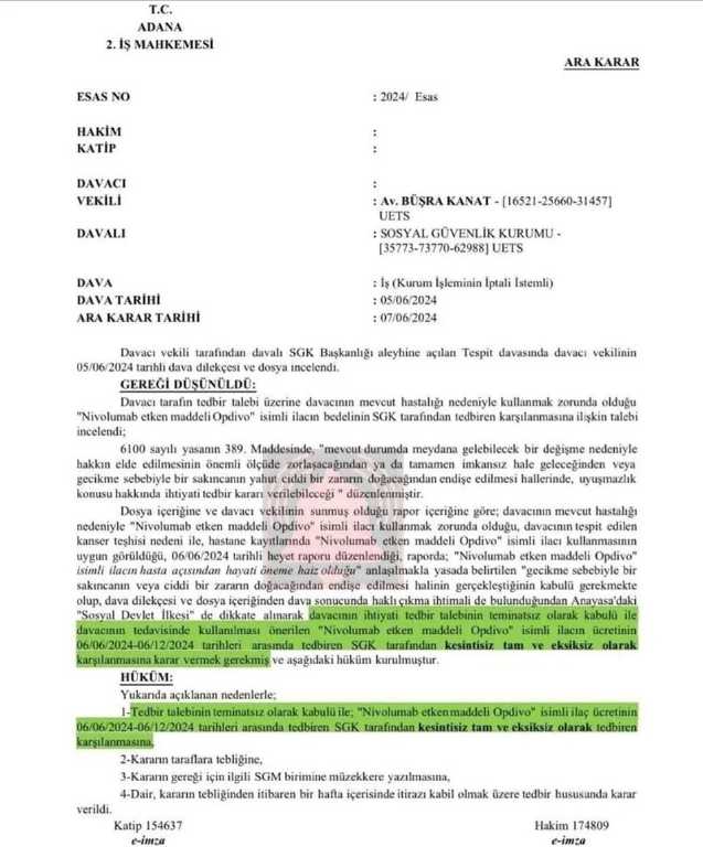 Adana’da yaşayan ve 5 yıldır böbrek kanseri ile mücadele eden erkek hasta A.U., tedavisi için ayda 3 doz kullanması gereken Opdivo isimli kanser ilacını alacak maddi gücü olmayınca avukatı Büşra Kanat aracılığıyla ilacın SGK tarafından ücretsiz karşılanması için 5 Haziran 2024’te "kurum işleminin iptali istemli" dava açtı.