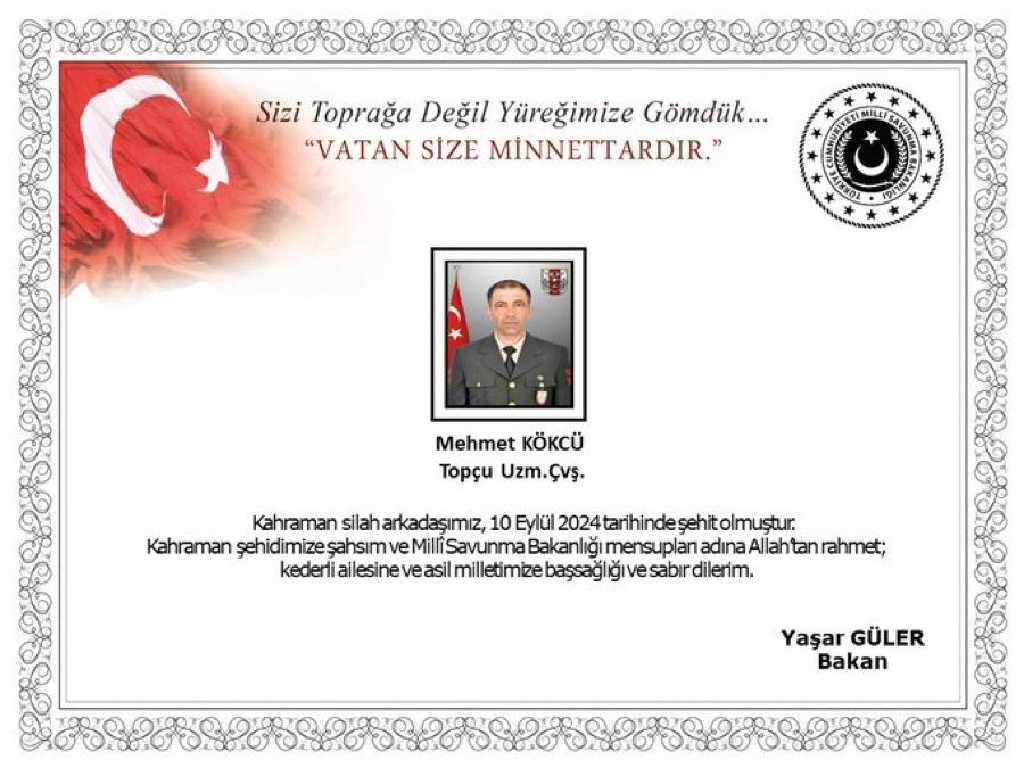 İzmir'in Menemen ilçesi 57'nci Tugay Komutanlığı'nda görev yapan Malatyalı Topçu Uzman Çavuş Mehmet Kökcü, geçirdiği kalp krizi sonucu kaldırıldığı hastanede şehit oldu.