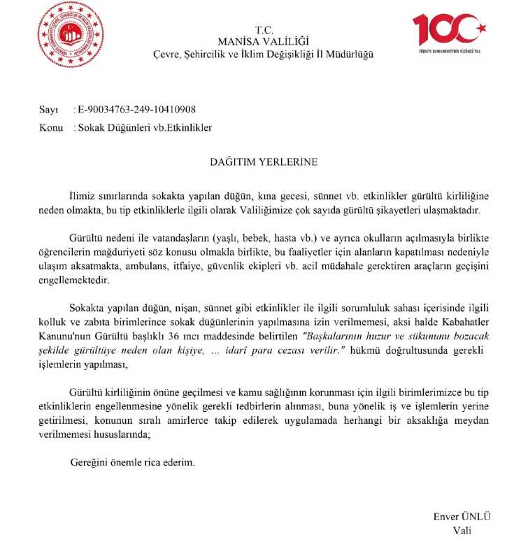 Manisa Valiliği geçtiğimiz hafta ilçe kaymakamlıklara gönderdiği kararla kırsal kesimler hariç il sınırları içerisinde sokakta yapılan düğün, nişan, sünnet gibi toplu eğlence törenlerinin yasaklandığını duyurdu.