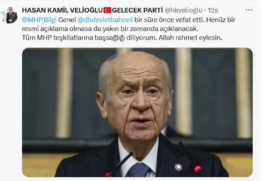 MHP Lideri Bahçeli'nin vefat ettiğini iddia eden Velioğlu, "Devlet Bahçeli bir süre önce vefat etti. Henüz resmi açıklama olmasa da yakın bir zamanda açıklanacak. Tüm MHP teşkilatlarına başsağlığı diliyorum" ifadelerini kullanmıştı.