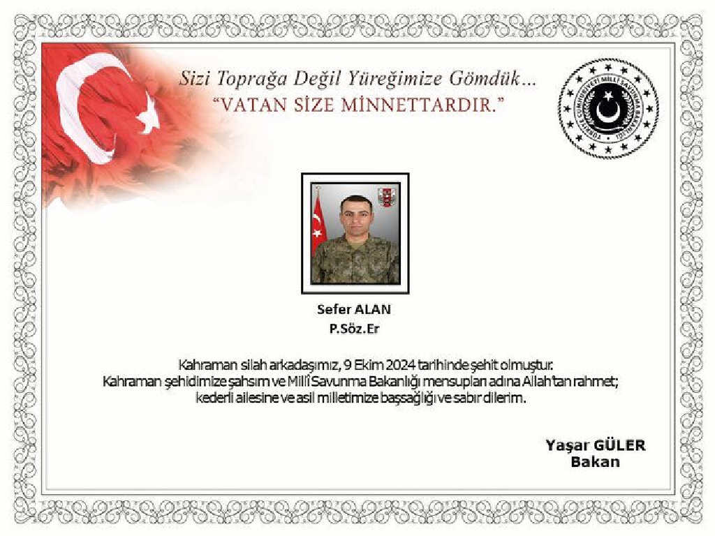Milli Savunma Bakanlığı'ndan yapılan açıklamaya göre Pençe-Kilit operasyonu bölgesinde bugün, bir grup terörist, güvenlik güçlerine taciz ateşi açtı. Bu saldırıda ağır yaralanan Piyade Sözleşmeli Er Sefer Alan, kaldırıldığı hastanede şehit oldu.