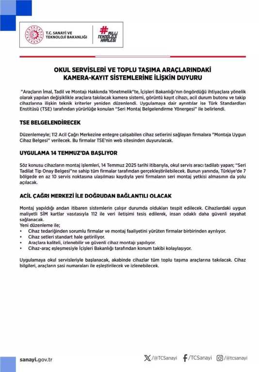 Buna göre tüm okul servislerine ve toplu taşıma araçlarına kamera, görüntü kayıt cihazı, acil durum butonu ve takip cihazı takılması artık zorunlu. Cihazlar 112 Acil Çağrı Merkezi’ne entegre olacak şekilde çalışacak. Montajı yapacak firmalar ve cihaz sağlayıcıları Türk Standardları Enstitüsü (TSE) tarafından belgelendirilecek.