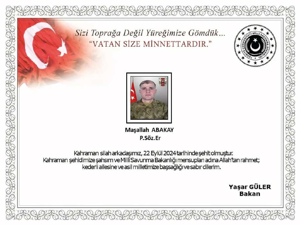 Milli Savunma Bakanlığı'ndan (MSB) yapılan açıklamada Pençe Kilit operasyon bölgesinde, 22 Eylül 2024 tarihinde, bölücü terör örgütü mensupları tarafından yapılan sızma girişimi esnasında Piyade Sözleşmeli Er Maşallah Abakay'ın şehit olduğu bildirildi.