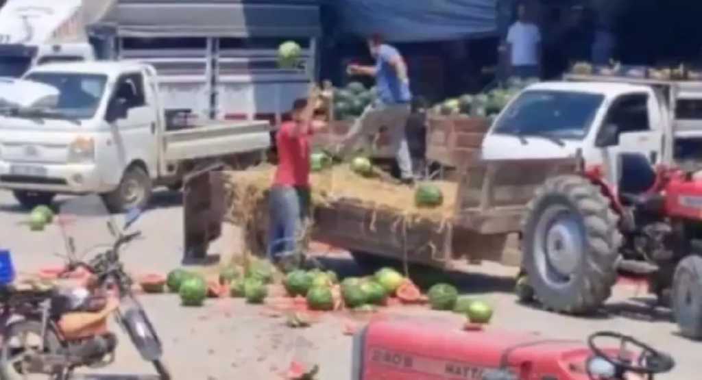 Ancak toptancının alımı reddetmesi üzerine sinirlenen iki üretici, satamadıkları karpuzları yere atarak parçaladı. O anlar çevrede bulunan bir kişi tarafından cep telefonuyla kaydedildi.