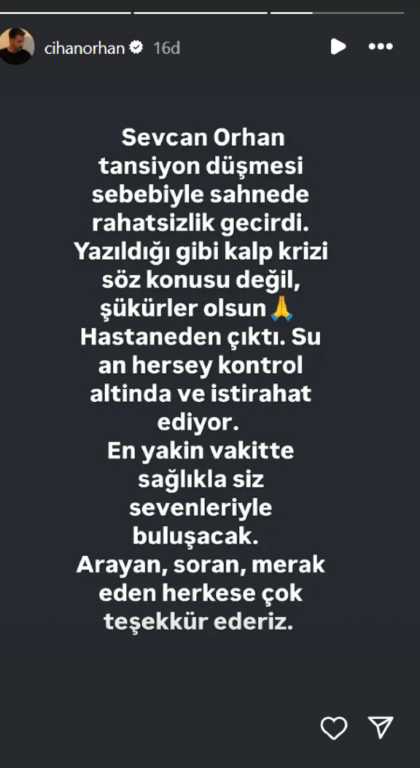 Orhan, "Sevcan Orhan, tansiyon düşmesi nedeniyle sahnede rahatsızlık geçirdi. Yazıldığı gibi kalp krizi söz konusu değildir. Şükürler olsun hastaneden çıktı. Şu an her şey kontrol altında ve istirahat ediyor. En yakın zamanda sağlıkla sevenleriyle buluşacak. Arayan, soran ve merak eden herkese çok teşekkür ederiz." dedi.