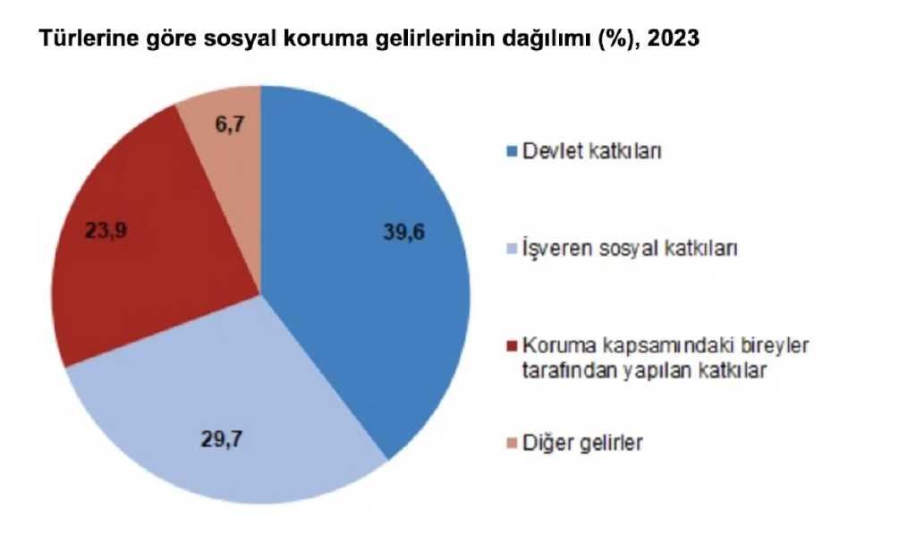 Sosyal koruma gelirlerinin yüzde 39,6'sını devlet katkıları, yüzde 29,7'sini işveren sosyal katkıları ve yüzde 23,9'unu koruma kapsamındaki bireyler tarafından yapılan sosyal katkılar oluşturdu.
