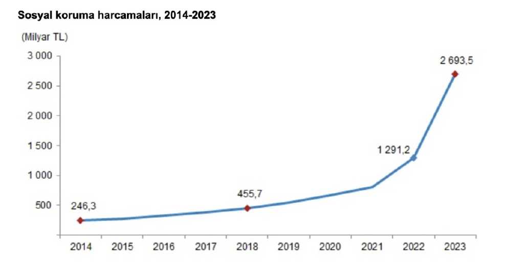 Türkiye İstatistik Kurumu (TÜİK) verilerine göre, sosyal koruma harcaması 2023 yılında bir önceki yıla göre yüzde 108,6 artış göstererek 2 trilyon 693 milyar 497 milyon TL oldu.