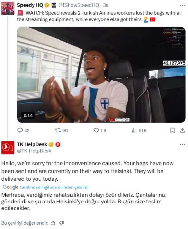 Sosyal medya fenomeni IShowSpeed, Türkiye'den ayrıldığı hava yolu şirketi personelinin, valizlerini ve ekipmanlarını uçağa almaya izin vermediğini iddia etti. THY yaptığı açıklamada; fenomenden özür dileyerek, valizlerin gönderildiğini aktardı.