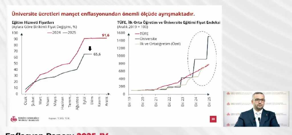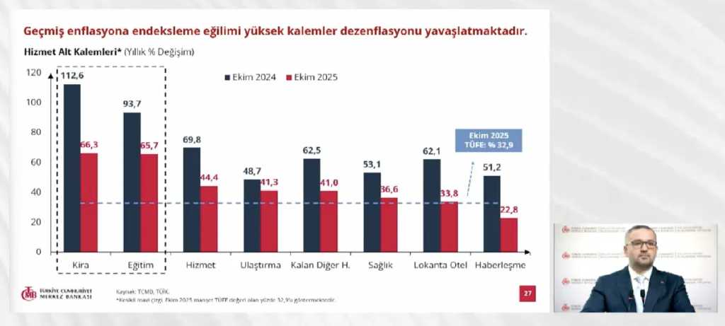 Karahan, son iki ayda enflasyon gerçekleşmelerinin tahmin aralıklarının üzerinde çıktığını, özellikle gıda ve kira kaynaklı baskıların sürdüğünü söyledi. Talep koşullarındaki dengelenmenin devam ettiğini ancak dezenflasyon sürecinin son dönemde yavaşladığını belirtti. Ana eğilim enflasyonunun yüzde 20 seviyesinde seyrettiğini, hizmet enflasyonunun ise dirençli kaldığını açıkladı.
