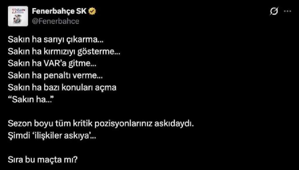 Kulübün açıklamasında, “Sakın ha sarıyı çıkarma… Sakın ha kırmızıyı gösterme… Sakın ha VAR’a gitme… Sakın ha penaltı verme… Sakın ha bazı konuları açma… Sezon boyu tüm kritik pozisyonlarınız askıdaydı. Şimdi ‘ilişkiler askıya’… Sıra bu maçta mı?” sözlerine yer verildi.