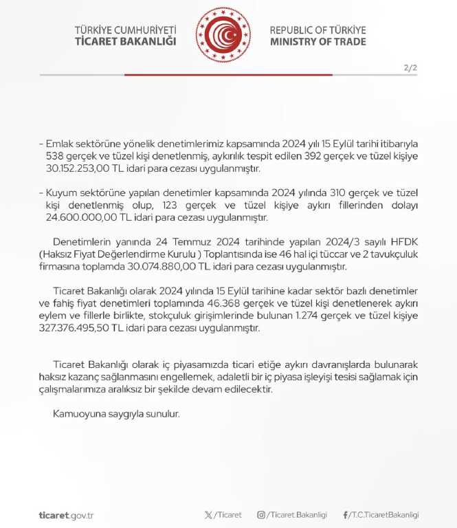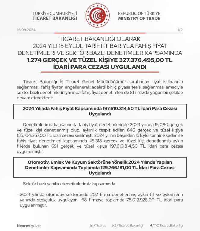 Ticaret Bakanlığı olarak 2024 yılında 15 Eylül tarihine kadar sektör bazlı denetimler ve fahiş fiyat denetimleri toplamında 46 bin 368 gerçek ve tüzel kişi denetlenerek aykırı eylem ve fillerle birlikte, stokçuluk girişimlerinde bulunan 1274 gerçek ve tüzel kişiye 327 milyon 376 bin 495,50 TL idari para cezası uygulanmıştır" ifadelerine yer verildi.