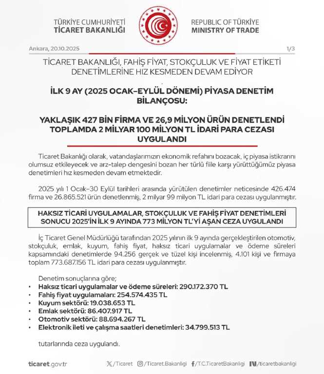 Ticaret Bakanlığı, 2025 yılının ilk 9 ayında yürütülen fahiş fiyat ve stokçuluk denetimlerinin sonuçlarını açıkladı. Bakanlık, 426 bin 474 firma ve 26 milyon 865 bin 521 ürünün denetlendiğini, toplamda 2 milyar 99 milyon TL tutarında idari para cezası uygulandığını duyurdu.