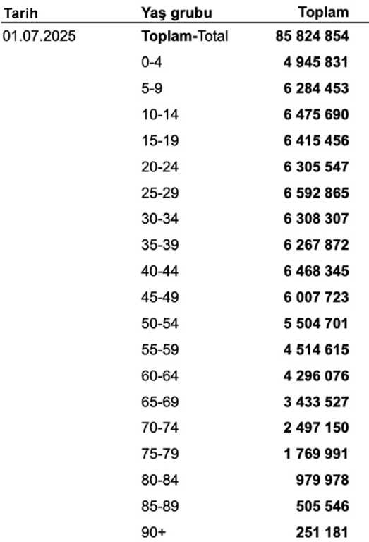 Türkiye İstatistik Kurumu (TÜİK), 1 Temmuz 2025 tarihi itibarıyla Türkiye nüfusunu açıkladı.