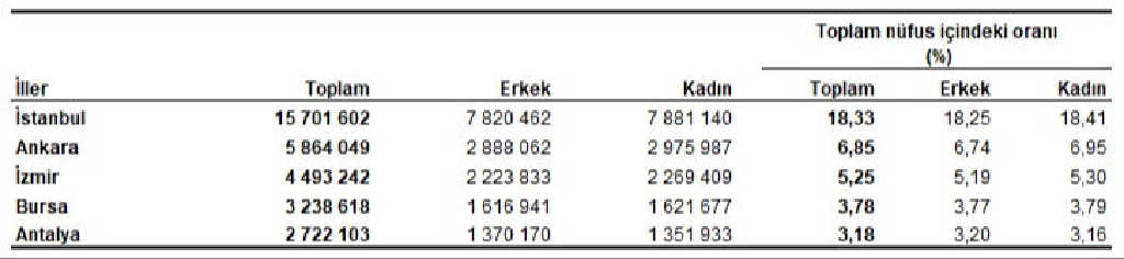 İstanbul'un nüfusu, bir önceki yıla göre 45 bin 678 kişi artarak 15 milyon 701 bin 602 kişi oldu. Türkiye nüfusunun %18,3'ünün ikamet ettiği İstanbul'u, 5 milyon 864 bin 49 kişi ile Ankara, 4 milyon 493 bin 242 kişi ile İzmir, 3 milyon 238 bin 618 kişi ile Bursa ve 2 milyon 722 bin 103 kişi ile Antalya izledi.