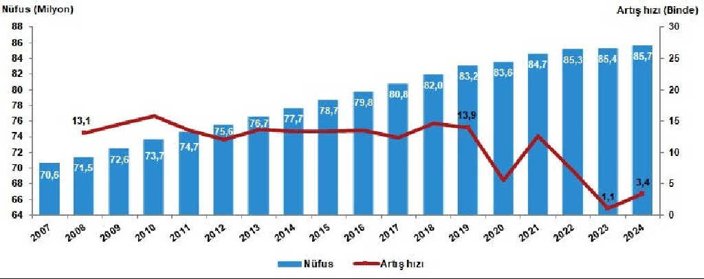 Türkiye'de ikamet eden nüfus, 31 Aralık 2024 tarihi itibarıyla bir önceki yıla göre 292 bin 567 kişi artarak 85 milyon 664 bin 944 kişi oldu.