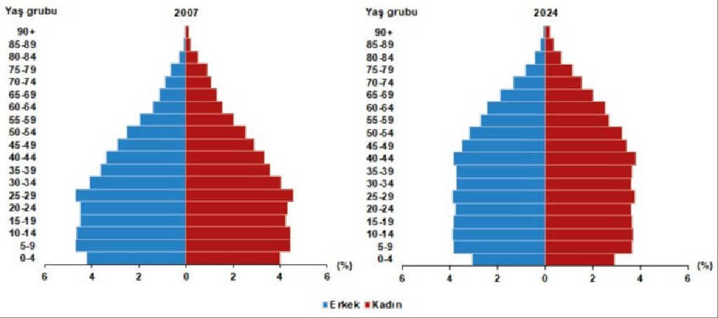 Nüfus piramitleri, nüfusun yaş ve cinsiyet yapısında meydana gelen değişimi gösteren grafikler olarak tanımlanmaktadır. Türkiye'nin 2007 ve 2024 yılı nüfus piramitleri karşılaştırıldığında, doğurganlık ve ölümlülük hızlarındaki azalmaya bağlı olarak, yaşlı nüfusun arttığı ve ortanca yaşın yükseldiği görülmektedir.