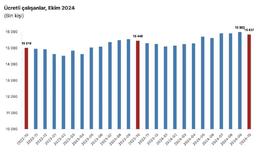 Ücretli çalışan sayısı bir önceki yılın aynı ayında 15 milyon 448 bin 458 kişi iken, 2024 yılı Ekim ayında 15 milyon 837 bin 471 kişi oldu.