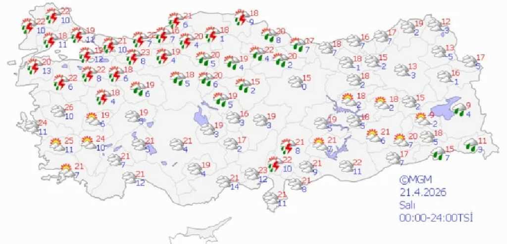 18-21 Nisan tarihleri arasında özellikle iç ve doğu kesimlerde yerel olarak kuvvetli yağış bekleniyor. Yetkililer, yıldırım, kısa süreli dolu ve ani sel riskine karşı dikkatli olunması gerektiğini bildirdi.