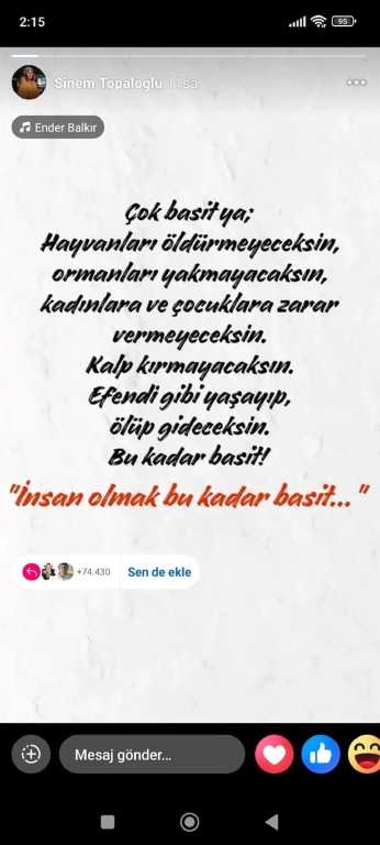 Sinem Somun’un ise sosyal medya hesabından, "Çok basit ya. Hayvanları öldürmeyeceksin, ormanları yakmayacaksın, kadınlara ve çocuklara zarar vermeyeceksin. Kalp kırmayacaksın. Efendi gibi yaşayıp, ölüp gideceksin. Bu kadar basit. İnsan olmak bu kadar basit." diye paylaşım yaptığı görüldü.
