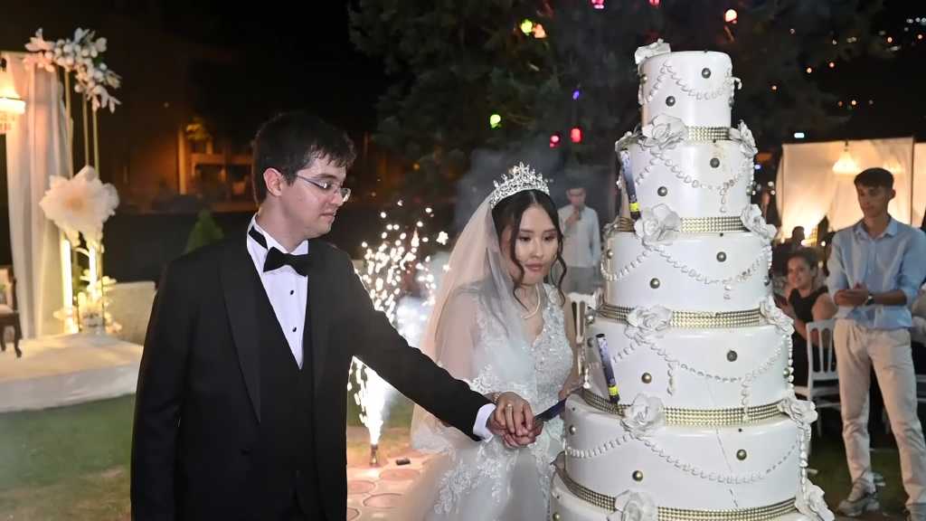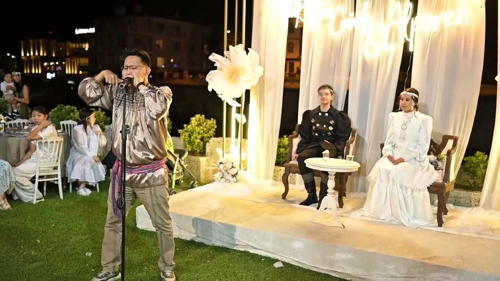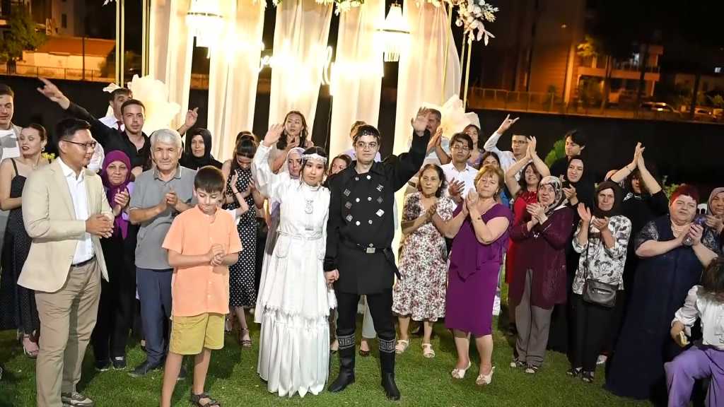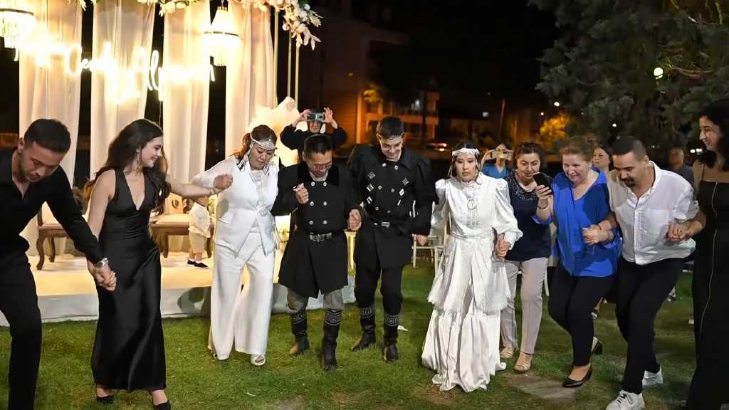Nikahın ardından pasta kesip dans eden çift sonrasında Yakutistan geleneklerini yansıtan gelinlik ve damatlık giydi. Çiftin renkli düğününe Yakut gelenekleri damga vurdu.