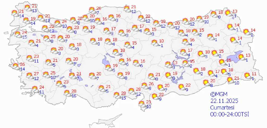 Meteoroloji Genel Müdürlüğü’nün son raporlarına göre Türkiye, kasım ayının ortasında adeta yazdan kalma bir hava dalgasının etkisi altında. Cezayir üzerinden gelen sıcak hava akımını taşıyan lodos, yurt genelinde sıcaklıkları mevsim normallerinin 5-6 derece üzerine taşıyacak. Birçok kentte sıcaklık 20 derecenin üzerine çıkarken, Antalya’da termometrelerin 29 dereceyi göstermesi bekleniyor.