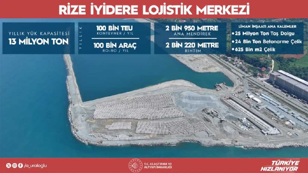 Ulaştırma ve Altyapı Bakanı Abdulkadir Uraloğlu, Rize İyidere Lojistik Limanı’nın Karadeniz’in en önemli ticaret merkezlerinden biri haline geleceğini açıkladı. Bakan Uraloğlu, tamamlandığında yılda 13 milyon ton kapasiteye ulaşacak olan limanın, bölgesel ticaretin kalbi olacağını belirtti.