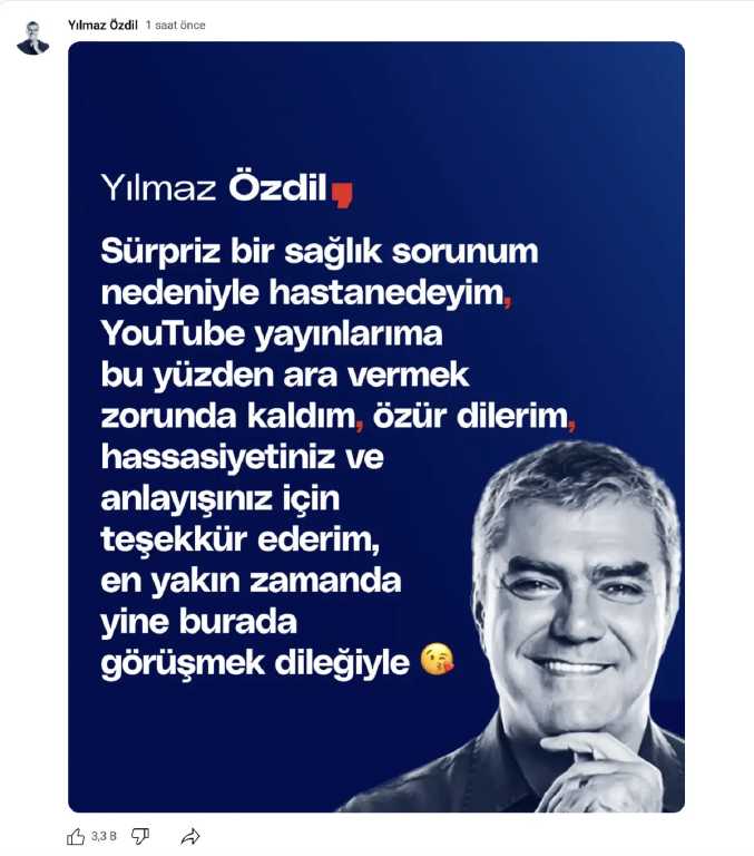 Youtube yayını yapmasının ardından hayranları tarafından merak edilen Yılmaz Özdil, hesabından bir açıklama yaptı. Özdil, açıklamasında "Sürpriz bir sağlık sorunu" ifadelerini kullandı ve şöyle dedi: